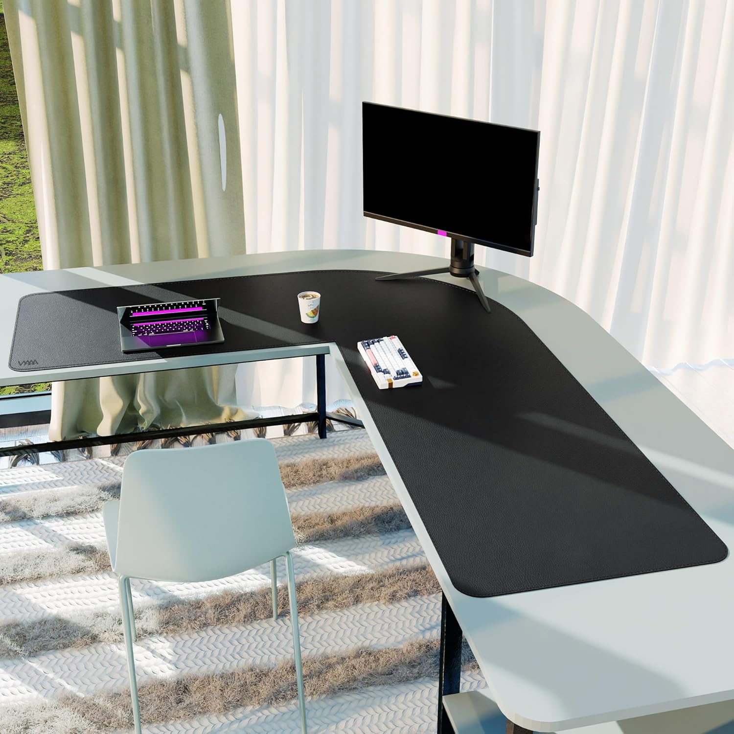 Vyaaa (59″+70.8″) x 23.6″ L Shaped Leather Desk Pad (Black), Dual-Sided Reversible PU Leather Desk Mat, Extra Large Mouse Pad, Compatible with L Shape Computer Desk for Home or Office